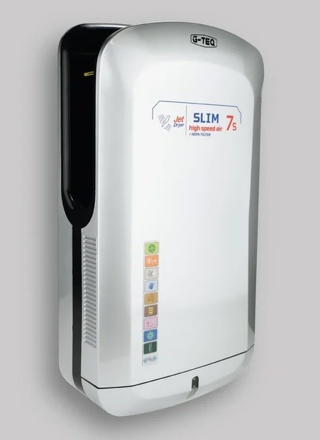 Сушилка для рук G-TEQ G-1800 PS - одна из самых производительных и эффективных сушилок на рынке. Благодаря высокой скорости потока воздуха и технологии его подачи под определенным углом со скоростью 95 м/с, один цикл составляет всего 10 секунд, т.е именно за это время руки становятся сухими.