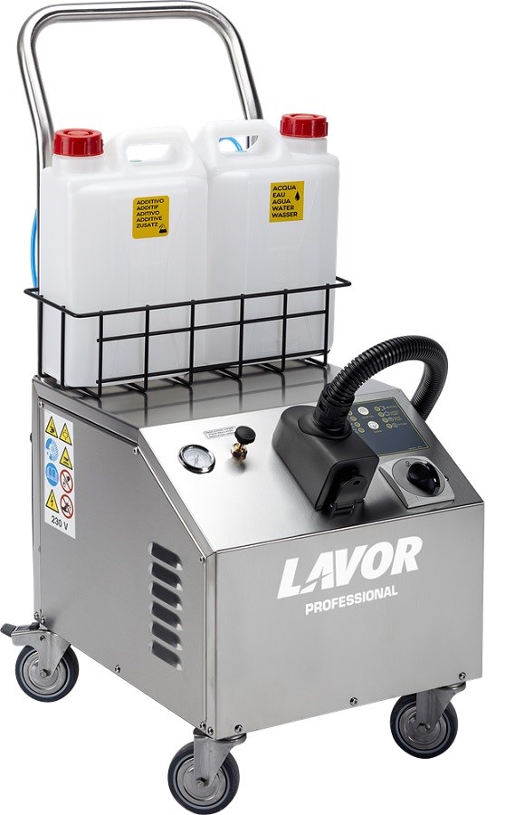 Парогенератор Lavor (Лавор) Pro GV 3,3 M Plus – это надежный и удобный в использовании аппарат для профессиональной очистки различных поверхностей и труднодоступных мест. Парогенератор для клинига Lavor Pro GV 3,3 MPlus проводит очистку при помощи водяного пара, нагретого до высокой температуры 175 градусов, а также при помощи пены из раствора моющего средства. Профессиональный парогенератор Lavor Pro GV3,3 M Plus имеет два отдельных бака емкостью по 5 л каждый для чистой воды и моющего раствора. При нагреве бойлер потребляет 3300 Вт. Для подключения используется розетка 220 В. Парогенератор для клининга Lavor Pro GV 3,3M Plus имеет вес 37 кг.