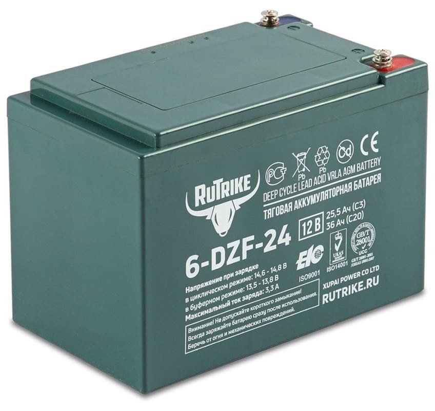 Аккумулятор RuTrike 6-DZF-24 - специальная тяговая батарея для тяжелой работы. Предназначен для глубокого разряда (Deep Cycle). Серия тяговых батарей DZM использует передовые мировые технологии, чтобы обеспечить аккумуляторам длительный срок службы, большую разрядную способность, высокую надежность, безопасность и экологичность. Аккумуляторы производятся из особого активного электротехнического материала.