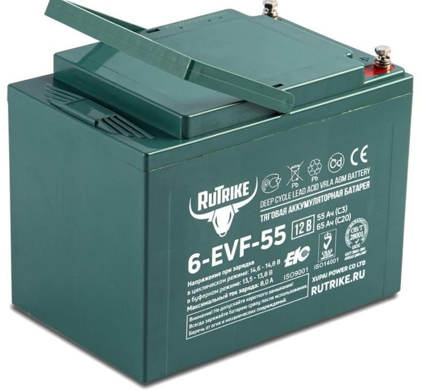 RuTrike 6-EVF-55 - необслуживаемая аккумуляторная батарея с системой рекомбинации газов (VRLA) произведенная по технологии AGM. Батареи выполнены по технологии внутреннего формования. В свинцовых пластинах, имеющих большую толщину по сравнению со стандартными аккумуляторами, используется экологичный запатентованный сплав без кадмия и мышьяка. Плотный сепаратор из углеволокна пропитан электролитом, изготовленным по технологии NANO GEL. Электролит находится в сгущенном состоянии, не даёт утечек и не требует долива воды на протяжении всего срока эксплуатации. Батареи Rutrike серии EVF имеют высокую производительность, способны выдерживать высокие токи разряда, работают в широком диапазоне температур.